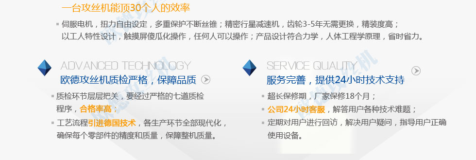 質量求生存的方針,我們真誠歡迎新老客戶選用我公司產品。公司注冊資金1000萬元。公司以可靠的電動攻絲機質量和合理的價位打動眾多消費者。公司創造了一流的售后服務。我公司一如既往地堅持數控攻絲機服務第一的宗旨。我公司以只有最好的精神指導各項工作大力塑造品牌。我公司新廠區擁有齊全的現代化生產設備。充分利用區域和行業優勢。精誠服務贏信譽是我們的鋼筋上絲機質量方針。進取精神是企業能與時俱進的動力和發展的源泉。鋼筋上絲機